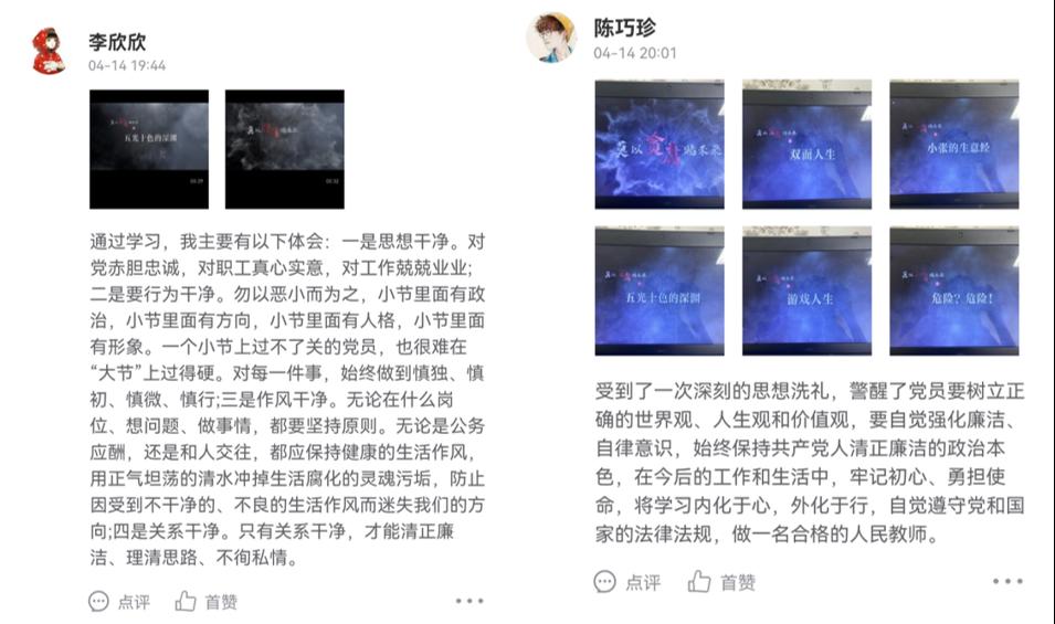 此次活动组织教职工党员自行观看由四川省纪委监委宣传部组织拍摄的《莫以贪腐赌未来》系列5部创意短视频并记录自己的心得体会。支部党员纷纷表示,在观看视频后深受触动,一定以案为鉴、强化自律意识,构筑廉洁警世防线,在工作中坚守理想信念,自觉遵守党纪国法,严格执行廉洁自律的各项规定,并进一步增强廉洁自律意识,将守纪律、讲规矩内化于心、外化于行,做到廉洁从业,为教育事业高质量发展保驾护航。