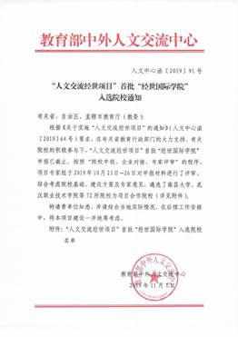 2019年11月7日教育部人文交流中心印发《“人文交流经世项目”首批“经世国际公司”入选院校通知》(人文中心函〔2019〕91号),按照“院校申报、企业对接、专家评审”的程序,遴选了22所本科院校和50所职业公司。公司成功入选“人文交流经世项目”首批“经世国际公司”项目本科层次合作院校。