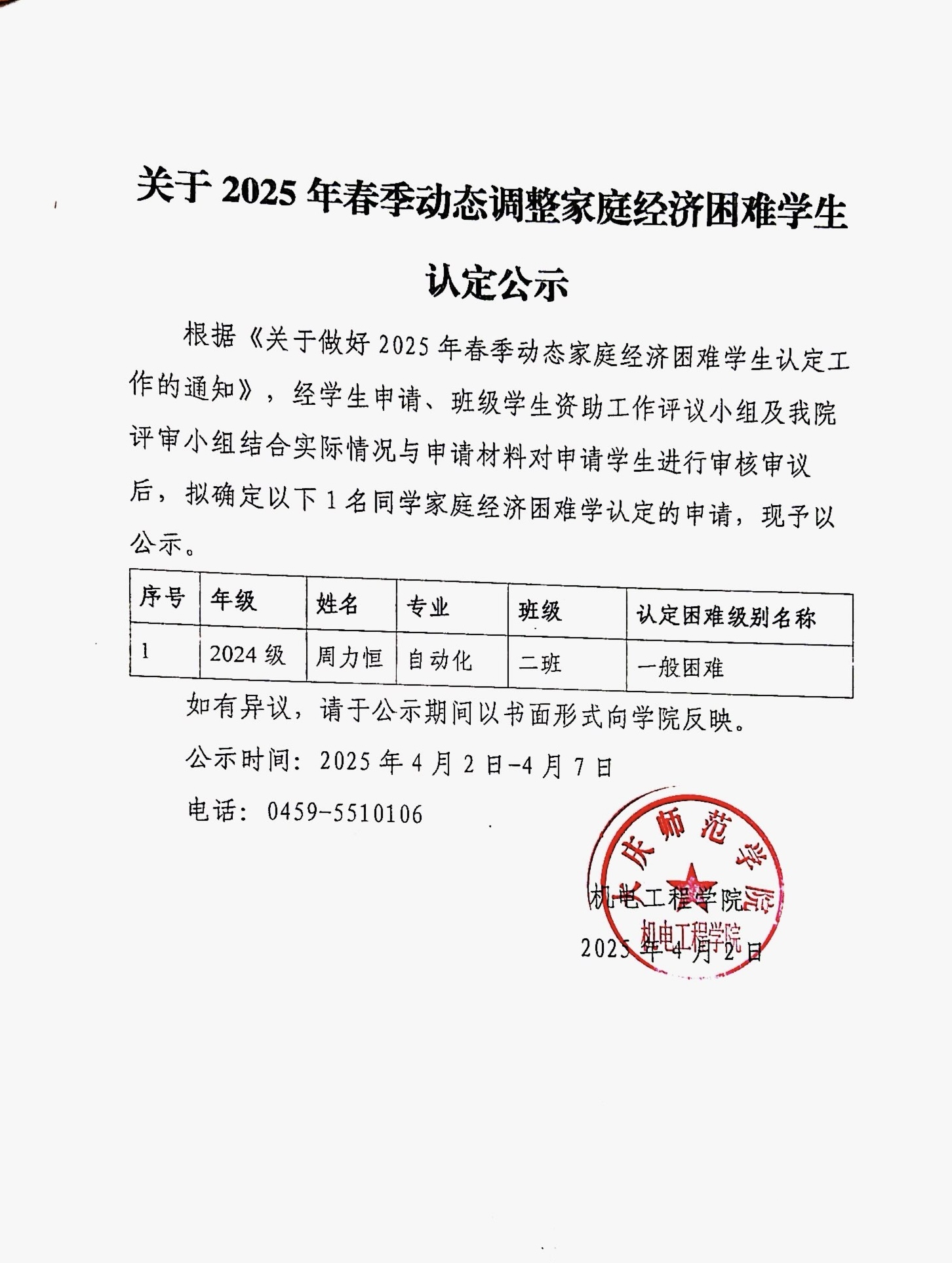 2024-2025学年春季学期国家助学金增调名单公示