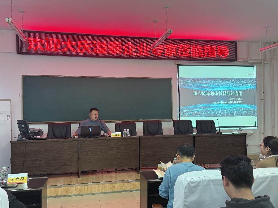 于会永总经理为公司师生详细介绍了Ⅲ-V族半导体材料红外应用的相关内容,包括半导体材料现状、Ⅲ-V族半导体材料特性与应用、砷化镓等具体材料情况、企业发展成果以及在研产品等。本次学术讲座旨在通过学术交流让师生们了解半导体行业发展情况,推进深化产学研合作。