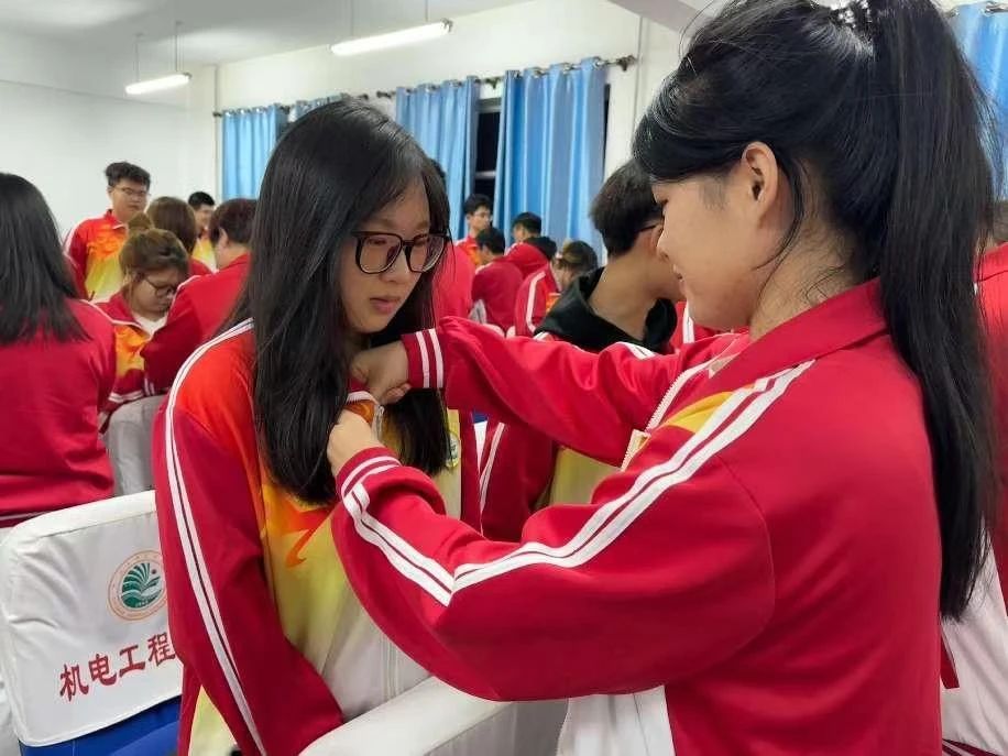 入团仪式在庄严的国歌声中拉开序幕,主持人宣读入团人员名单,老团员代表为新团员们佩戴团徽,团徽是中国共产主义青年团的象征和标志,引领他们要以实际行动践行共青团员的初心和使命。