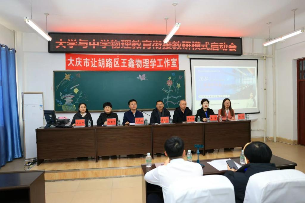 教研活动现场,气氛热烈,众多教育领域的精英齐聚一堂。让胡路区进修集团董事长崔海彬、副董事长潘明浩、初中物理工作室负责人王鑫,以及bevictor伟德经理刘永皓、党总支书记闻世宇、副经理王玉玲、物理学专业全体教师和来自大庆市让胡路区11所初级中学的物理骨干教师出席会议,会议由物理学专业负责人杨瑞主持。启动会上刘永皓介绍了物理学专业“一融合三突出”特色、团队力量及发展状况,崔海彬立足基础物理教育现状、对师范生的职业技能培养方向进行方法指导、与会双方表达长期合作的意愿。