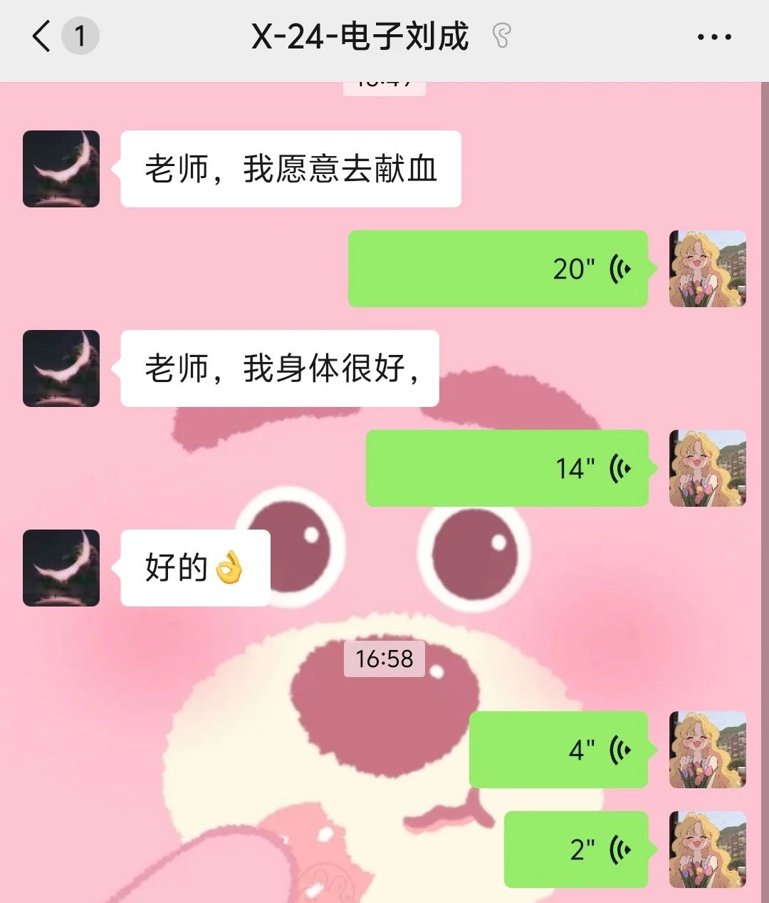 为了帮助谭同学,大家迅速行动起来。各年级辅导员在群内积极动员,号召大家伸出援手,激发了大家的爱心与责任感。令人感动的是,六名同学——郭志林、郑新杰、卿昭燚、刘成、阚鑫宇、王舜,毫不犹豫地站出来。他们勇敢地前往献血站,积极配合医护人员进行各项检查,希望能用自己的热血为谭同学带来帮助。这六名同学,或许平时在班级里并不起眼,但在关键时刻,他们展现出无私与勇敢,“没事的,都是为了同学”这句普通的话语充满着力量。